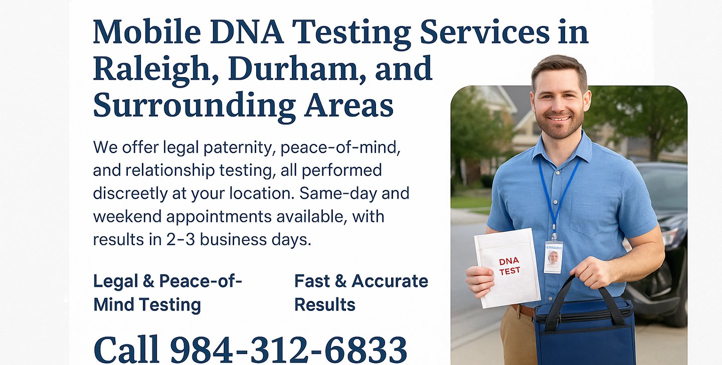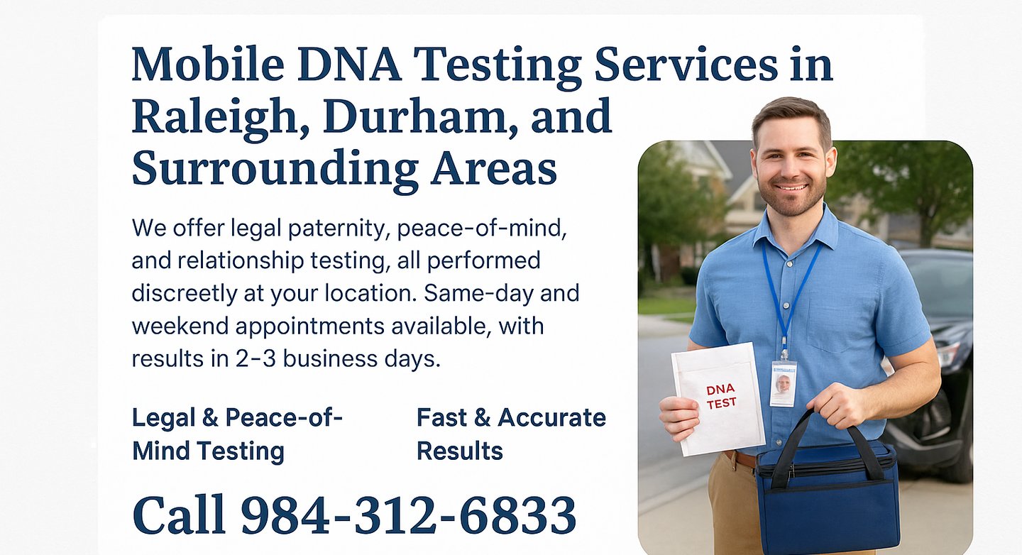 Call 984-312-6833 to book your mobile DNA testing in Raleigh, Durham, Henderson, Oxford, or Warrenton. Same-day and weekend appointments available.